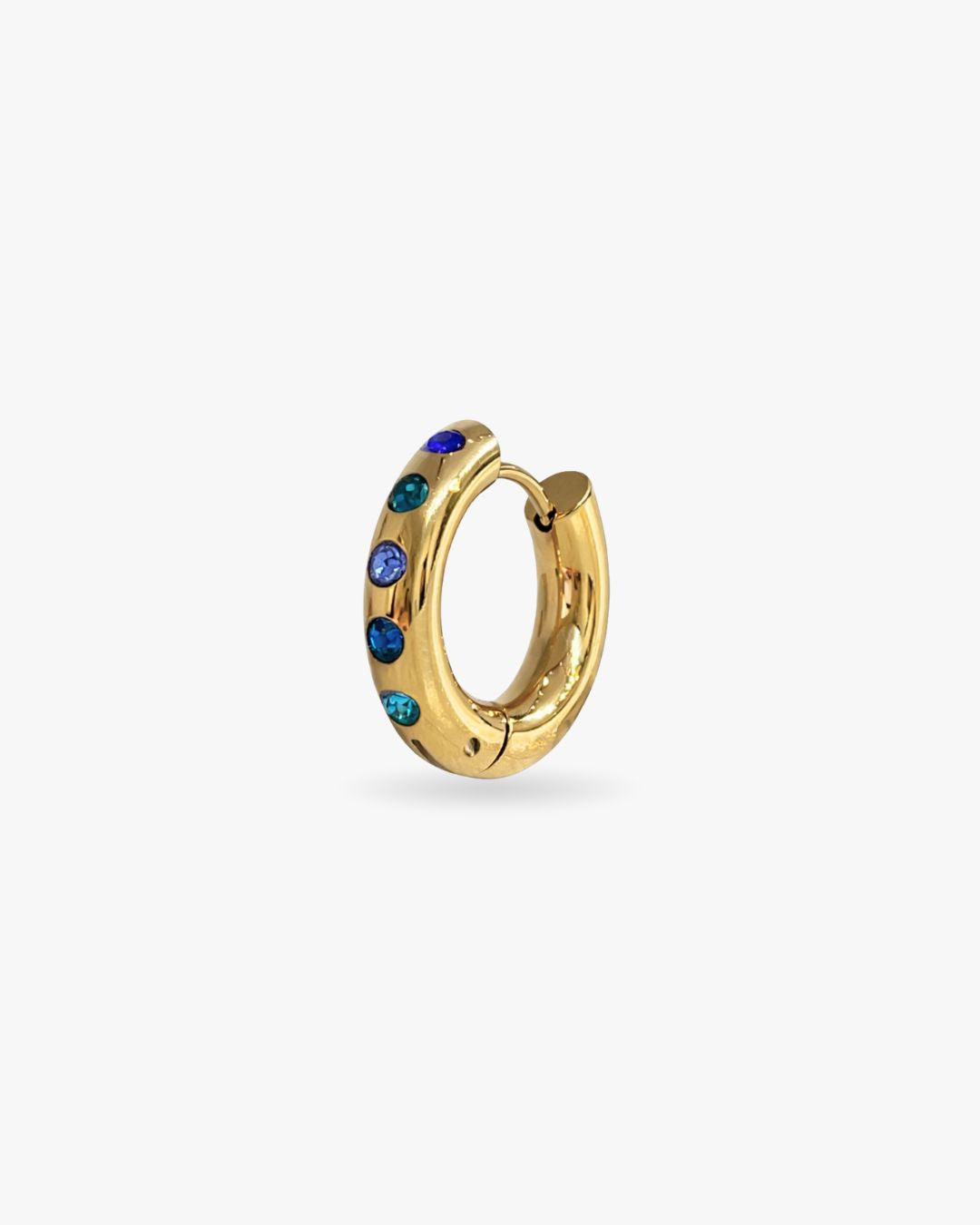 AQUALIS est une mono boucle en finition dorée, délicatement serti de pierres bleues aux nuances profondes, idéal pour habiller l’oreille avec élégance et apporter de la lumière au visage.