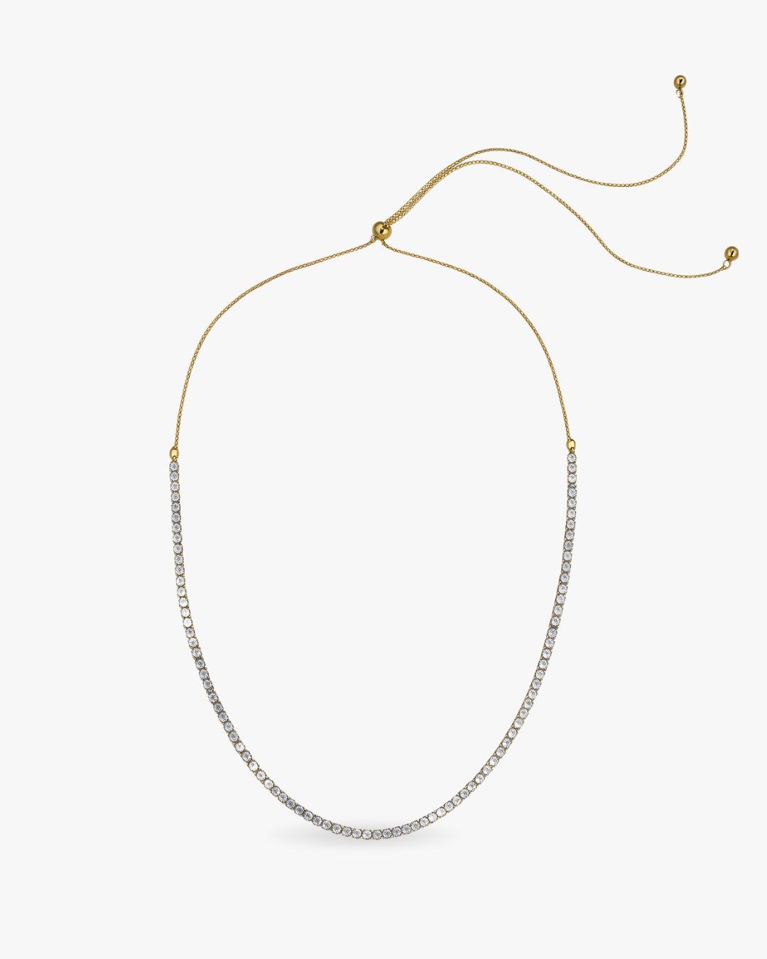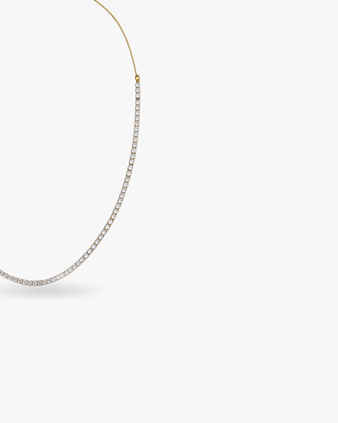 Délicat et éclatant, le choker AQUILA rivière de diamants épouse le cou avec une finesse absolue. Son rang de pierres scintillantes capte la lumière à chaque mouvement et sublime le décolleté avec une élégance intemporelle.