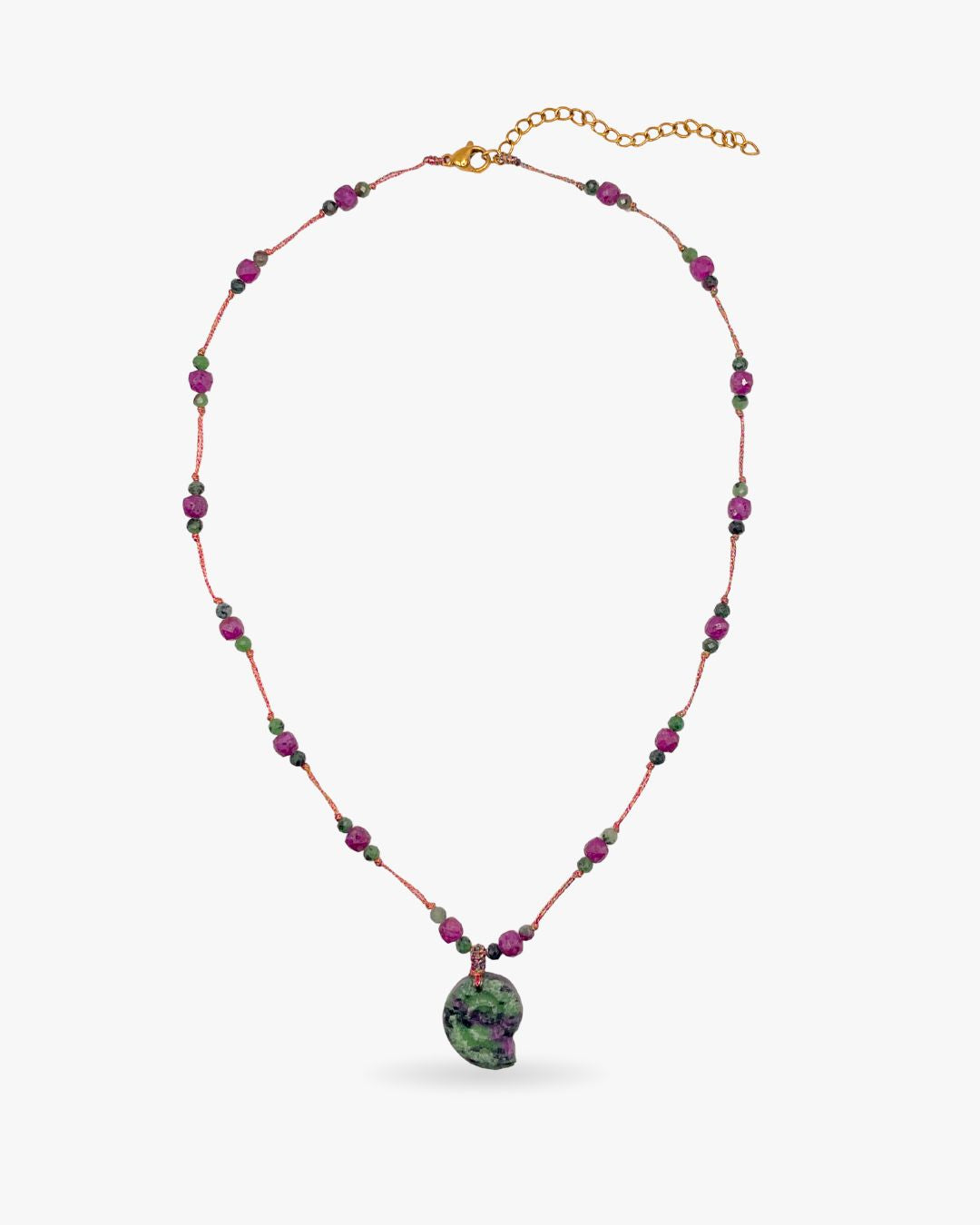 SHELL est un collier fin en pierres naturelles aux tons roses et verts, sublimé par un pendentif en pierre sculptée, pour une touche bohème, délicate et lumineuse à porter au quotidien.