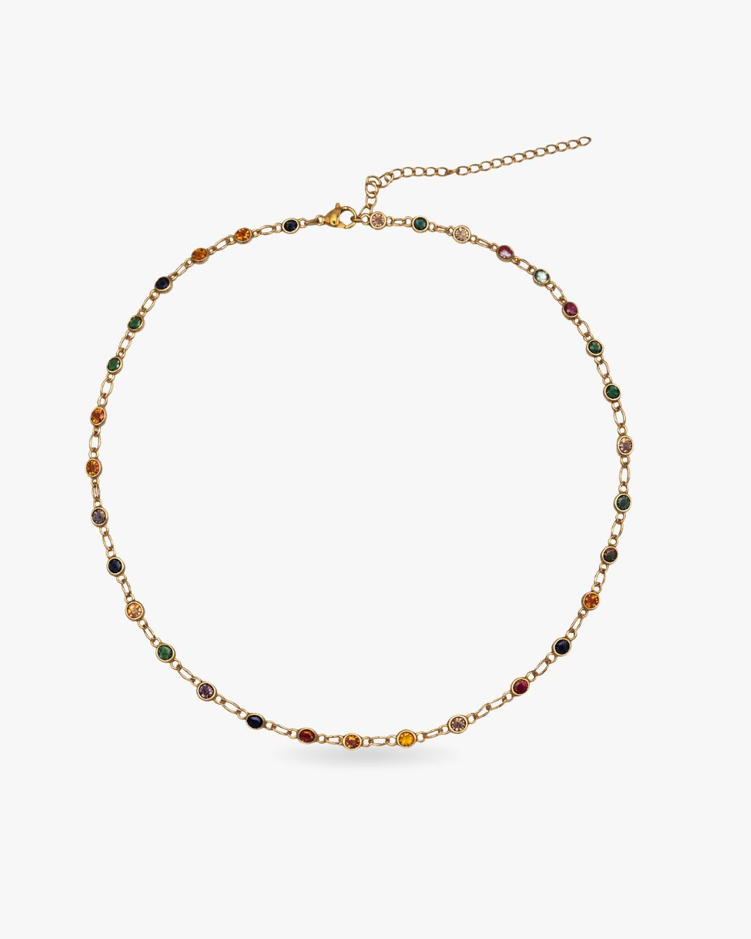 Fin et lumineux, le collier SPECTRA se distingue par sa chaîne dorée délicatement ponctuée de pierres aux nuances multicolores.