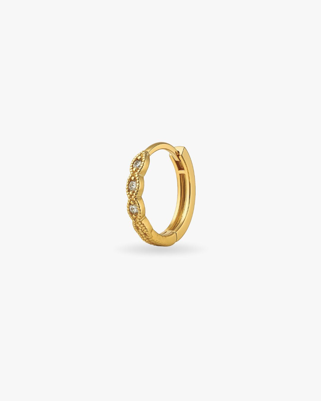 Sublimez votre oreille avec la mini créole ELEONOR, un anneau délicatement texturé et serti d’éclats lumineux pour une élégance discrète mais irrésistible.