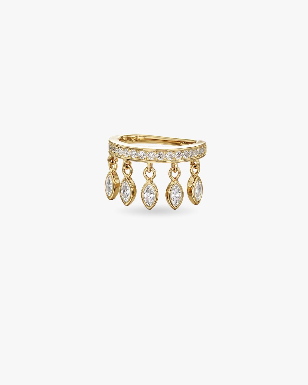 Sublimez votre oreille avec FLEURALIS, une bague d’oreille délicate au charme poétique. Son anneau finement serti de pierres scintillantes est orné de pendentifs délicats en forme de marquise, qui se balancent légèrement à chaque mouvement.