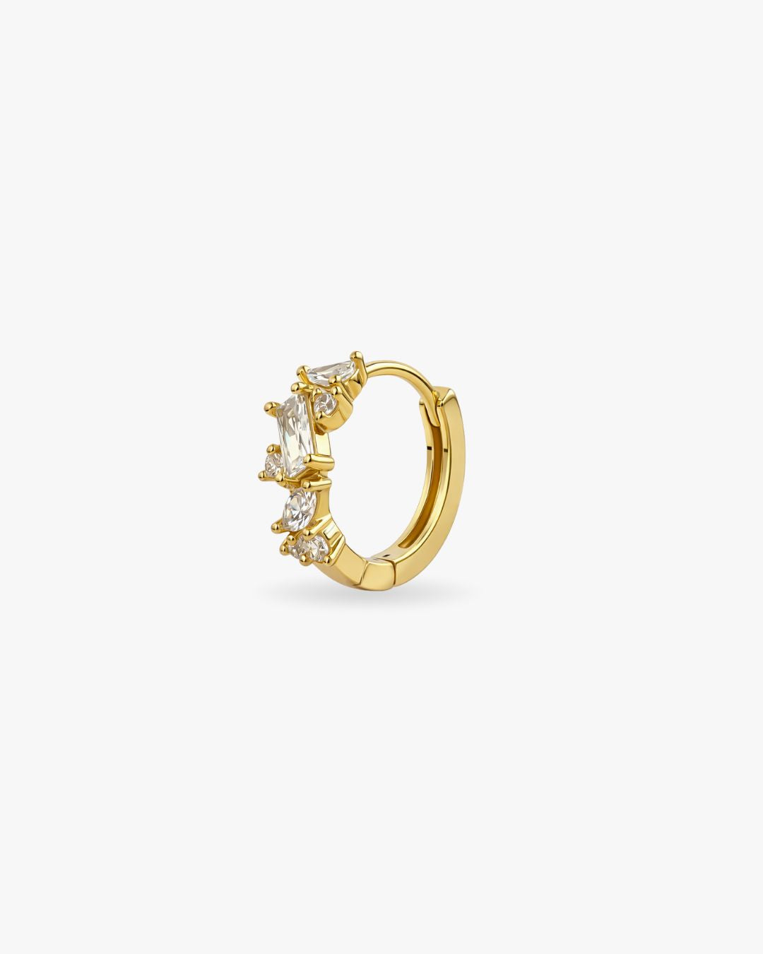Affirmez votre élégance avec SEREN, une mini créole en plaqué or ornée de zirconiums taillés aux formes variées pour un éclat raffiné.