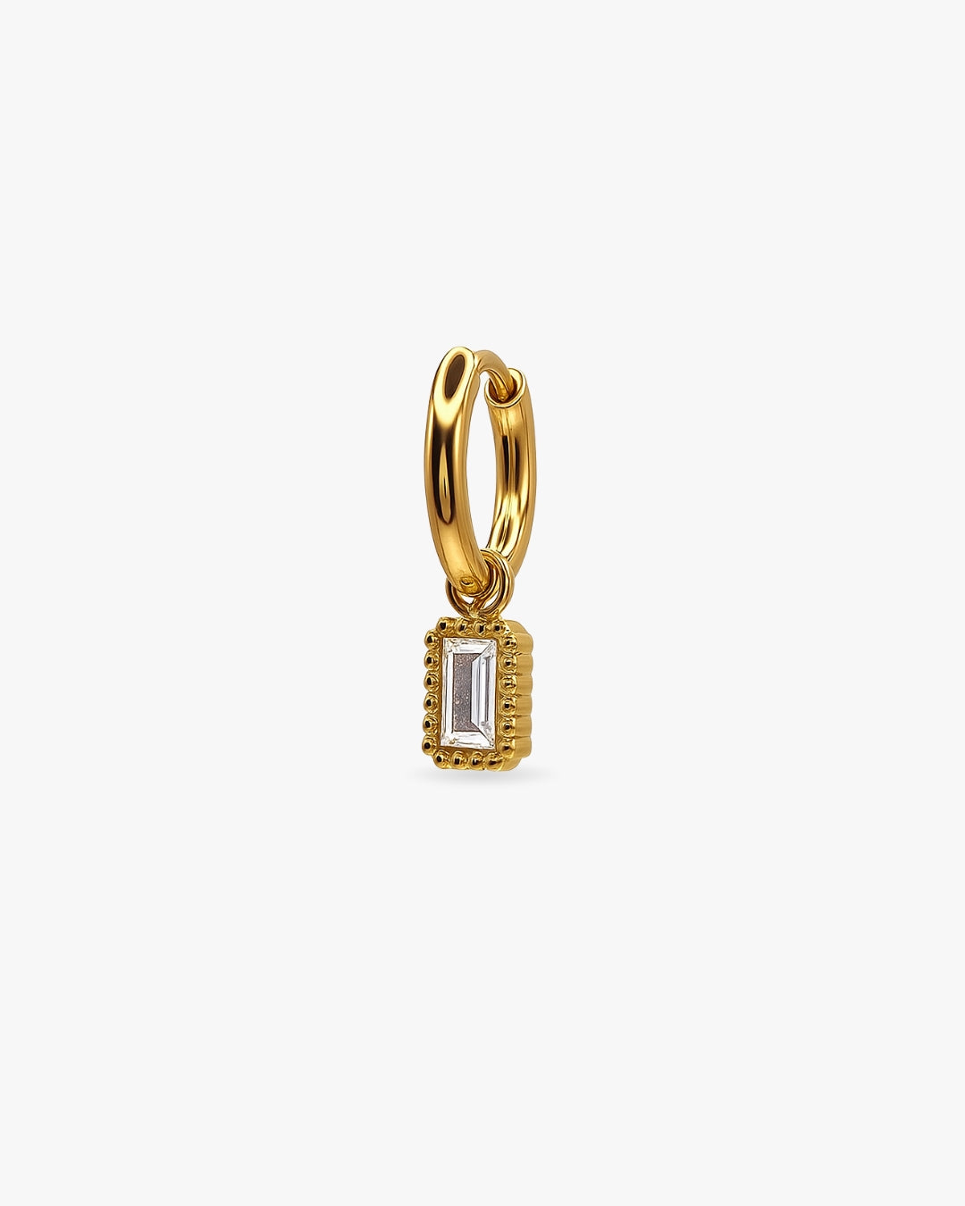 Faites rayonner votre oreille avec PALOMEE, une mono-boucle en acier inoxydable ornée d’un pendentif délicatement serti d’une pierre baguette lumineuse.